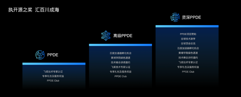 在发布会上,百度飞桨还发布了 PPDE(飞桨开发者技术专家)计划,号召全球 AI 开发者与百度飞桨一起共建开放的深度学习开源社区。