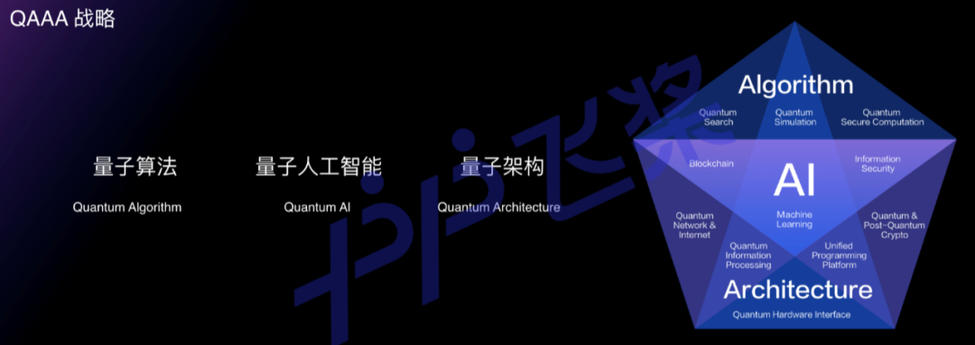 百度量子计算的 QAAA 规划:聚焦于量子算法、量子人工智能以及量子架构。其中量子算法是发挥量子计算优势的理论基础,量子人工智能则代表了量子计算实际落地最重要的一些软件技术工具,而量子架构则实现量子软硬件互连,最终这三者将融合在百度量子计算平台提供给合作伙伴和用户。