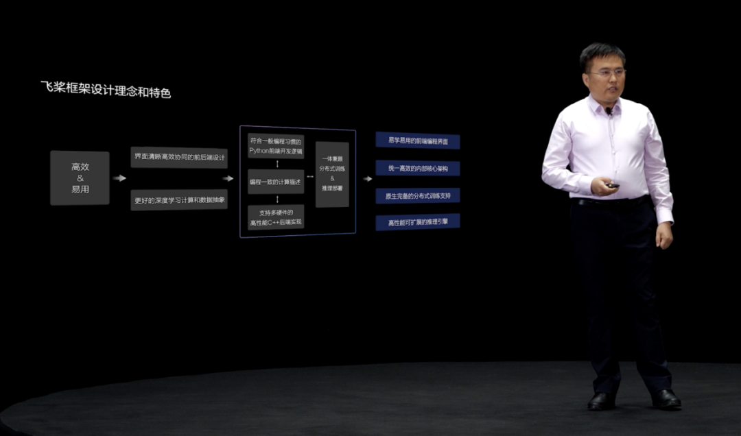 飞桨总架构师于佃海向我们介绍了飞桨框架的设计理念,以及推动飞桨迭代发展的两个驱动轮:产业实践的需求和用户体验的提升。产业实践的需求和打磨是最原生的驱动轮,这体现的是飞桨对性能、大规模训练和部署能力的极大关注。
