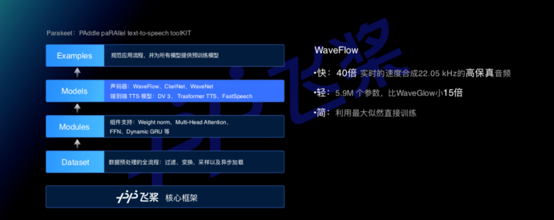 Parakeet 是本次飞桨平台全新发布的第二款开发套件。值得注意的是,在模型层,Parakeet 使用了一款百度自研声码器 WaveFlow。