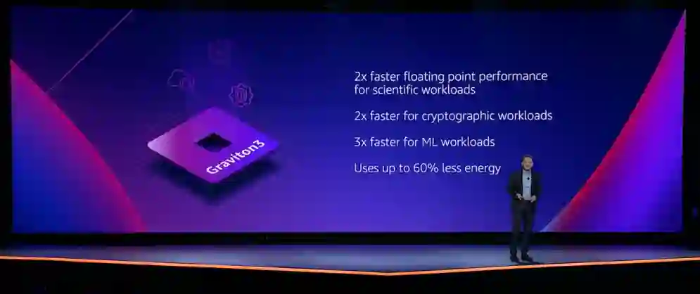 此次 re:Invnet 上发布的 Amazon Graviton3 官宣为科学计算、机器学习和媒体编码工作负载提供 2 倍的浮点运算性能,为加密工作负载速度提升 2 倍,为机器学习工作负载提供 3 倍的性能。在相同性能下,与同类型 Amazon EC2 实例对比,可节省高达 60% 的能源消耗。