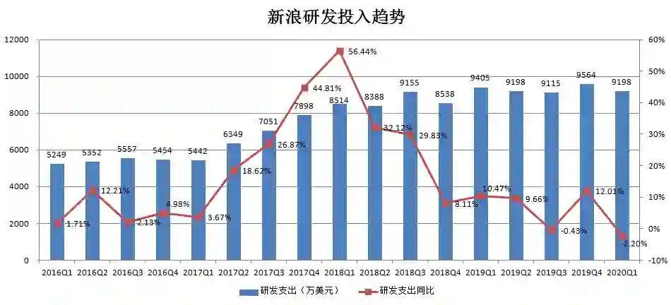 新浪的三大费用支出中,研发费用率自2016年Q2开始一直低于营销费用率。同时,自2018年Q1起,其研发支出同比增幅总体呈下降态势。
