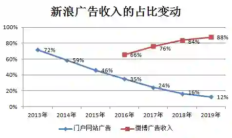 在过去的20年里,新浪从门户起家、靠微博业务立足,但即便成功完成从门户向微博转型,新浪的变现方式没变——广告收入常年占据着它50%以上的营收来源,近6年则升至80%以上。