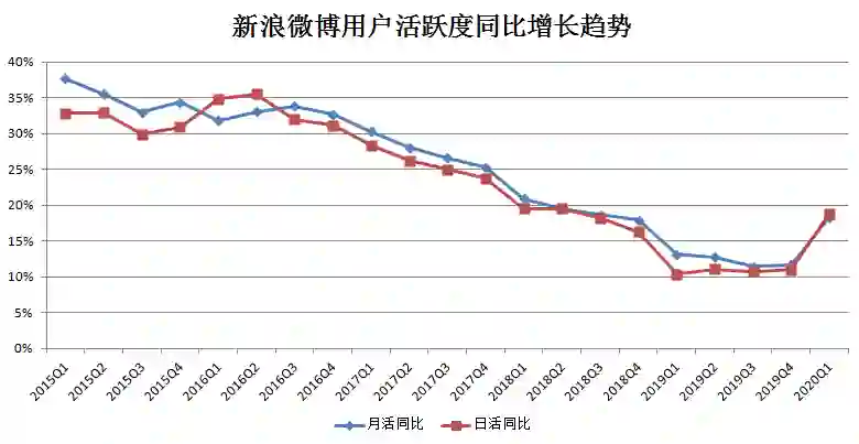 2020年Q1新浪微博月活用户数同比增加18.28%至5.5亿,日活用户数同比增加18.72%至2.41亿。用户活跃度同比增幅在该季度增长较多,但仍没有达到其2018年上半年之前的增长水平。而据抖音发布的《2019年抖音数据报告》,截至2020年1月,抖音日活用户同比增长60%至4亿。