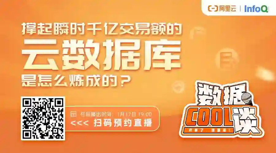 1 月 17 日 19:00,《数据 Cool 谈》第三期,阿里巴巴大淘宝技术部双 12 队长朱成、阿里巴巴业务平台双 11 队长裴度、阿里巴巴数据库双 11 队长智盛与 InfoQ 主编王一鹏一起,为你揭秘双 11 双 12 背后的数据库技术!扫码或点击【预约】按钮,预约直播~~