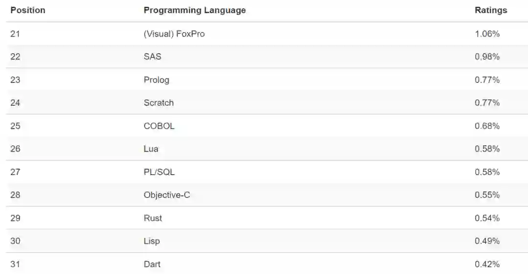 根据 11 月份最新发布的 TIOBE 编程语言排行榜数据,Rust 的占比仅为 0.54%,排名第 29 位。虽然相比今年年初,这个占比数据和排名已经略有提升,但距离排在第 18 位的 Go 语言(相比去年 11 月下降五位,占比 1.21%),还有不小的差距。