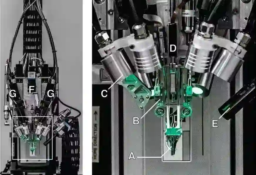 能够每分钟自动插入六根线(包含192个电极)。在图中,它看起来像是显微镜和缝纫机之间的交叉。在进行植入时还可以避免血管,这可能减轻大脑中的炎症反应。