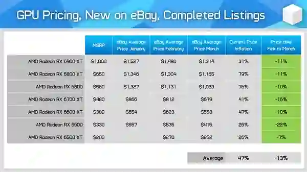 有外媒也统计了 eBay 上所有在售显卡的价格走势,对照 3 月中旬与 2 月的情况发现,所有显卡皆有不同程度的降价,最多跌幅超过 20%,平均亦有 8.8%。此前,2 月的价格已较 1 月下跌 11%,自去年 12 月以来,整体平均跌幅已达 25%。