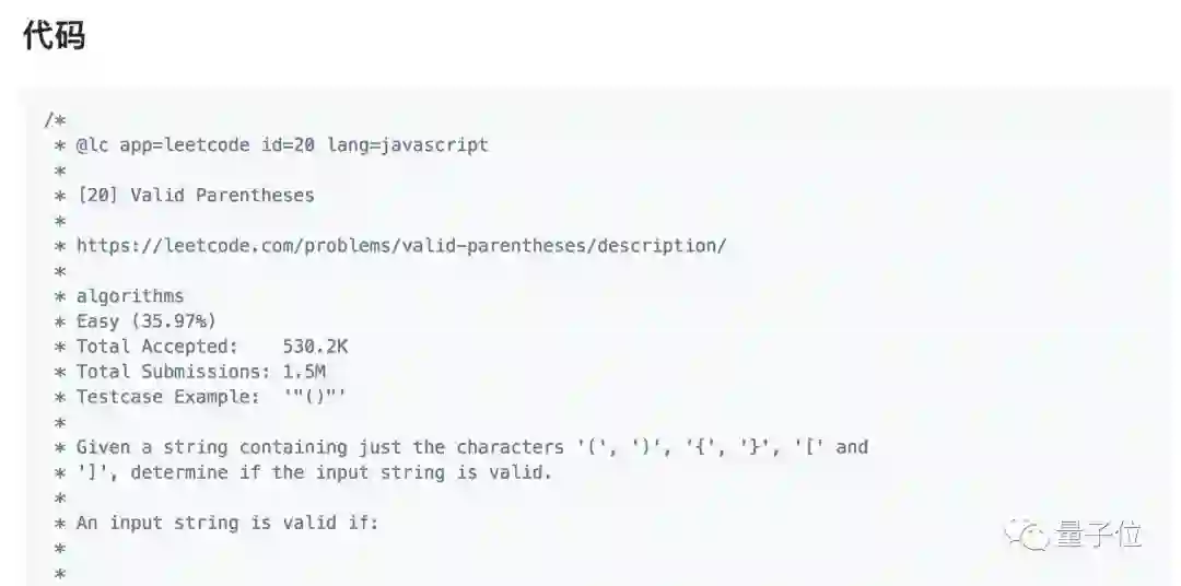 比如在第20题“有效括号”中,作者先放上了leetcode里的题目地址,贴上了题干的描述:
