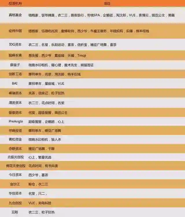 迄今为止,《1024好项目》已经全部更新完了 。这200个项目都得到了IDG资本,红杉资本中国、真格基金、创新工场、经纬中国、险峰长青等等知名投资机构的融资: