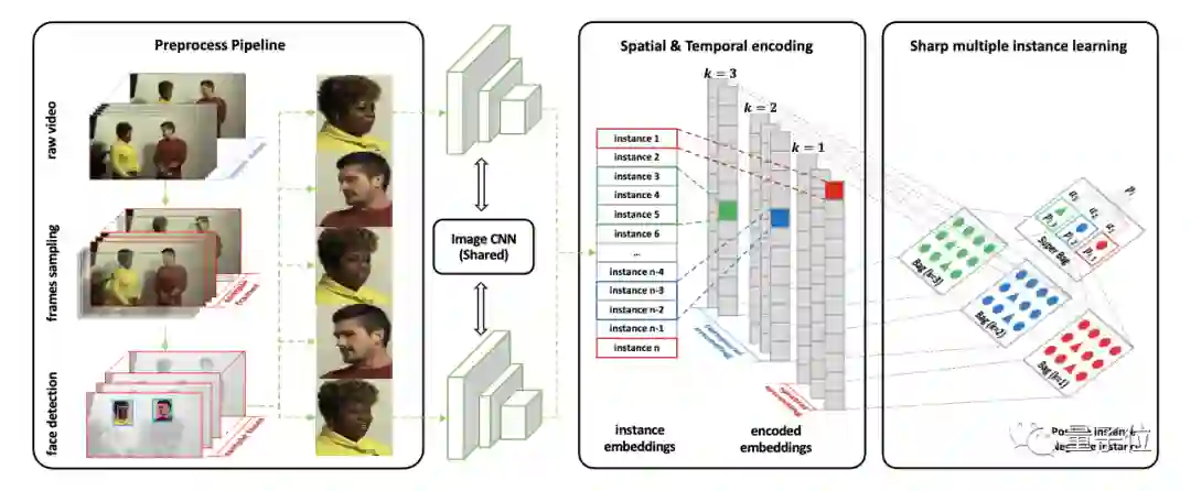 首先,对输入视频中的采样帧进行人脸检测,并将提取的人脸喂给CNN,以获取特征作为实例。