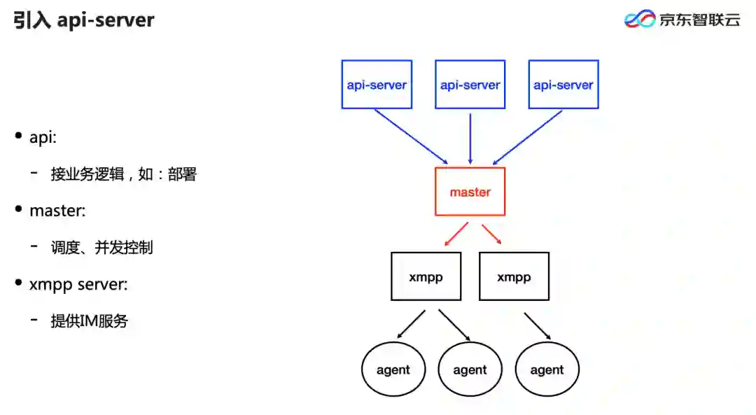 另一方面,控制系统的目的并非单纯地控制机器本身,而是要对外提供服务。所以在上述模型的基础上还需要一个 api-server,用来包装业务需求,将其变为可执行的任务通过 master 分发给 agent。加入 api-server 后模型也比较简单: