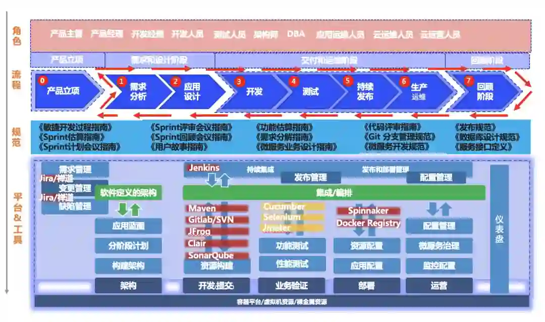 另外,在工具链的选择和管理上,需要进行统一。DevOps 工具链分为角色、流程、规范、平台和工具四大类别。其中,从产品经理到开发、运维、运营人员等等,都是工具链中的重要角色。DevOps 实际生产中存在许多流程,每个流程都需要工具化、具体化,以免遗漏。开发工作中涉及众多规范,各种规范共同形成了工具链中重要的基石。