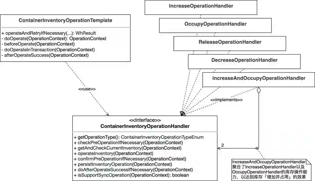 类似地,在数农WMS的库存操作重构中,我们定义了ContainerInventoryOperationTemplate「模板类」,作为承载库存操作业务逻辑的框架。下述为其中的库存操作核心代码片段。可以看到,框架统一定义了库存操作流程,并对其中的通用逻辑提供了支持,使各类不同的库存操作得以复用:如构建库存操作明细、持久化操作明细及同步任务、并发冲突重试等;而对于其中随不同库存操作类型变动的逻辑 —— 如操作库存数据、确认前置操作、持久化库存数据等 —— 则通过对ContainerInventoryOperationHandler接口实例的回调实现,它们可以被看作是库存操作框架代码中的扩展点。接口由不同类型的库存操作分别实现,如库存增加、库存占用、库存转移、库存释放等等。如此,如果我们后续需要添加某种新类型的库存操作,只需要实现ContainerInventoryOperationHandler接口中定义的个性化逻辑即可;而如果我们需要对整个库存操作流程进行迭代,也只需要修改ContainerInventoryOperationTemplate中的框架代码,而不是像先前那样,需要同时修改多处代码(这里模板类和库存操作handler的命名均以Container作为前缀,是因为数农WMS以容器托盘作为基本的库存管理单元)。