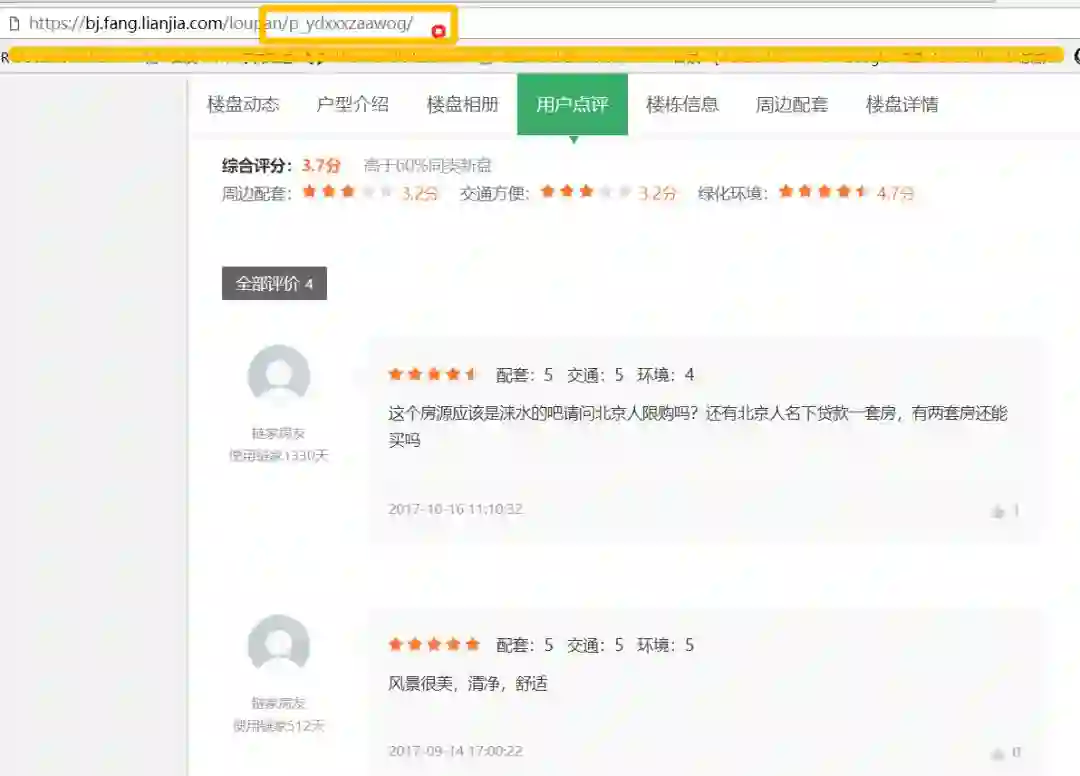 花了大半天的时间,做了这些,然后链家里面有价值的数据我觉得还有房源的评论数据,这个数据其实也不难爬,可以给大家看看。我们点房源的评论,网页就跳转到这个页面,url后面跟的这个是什么呢?