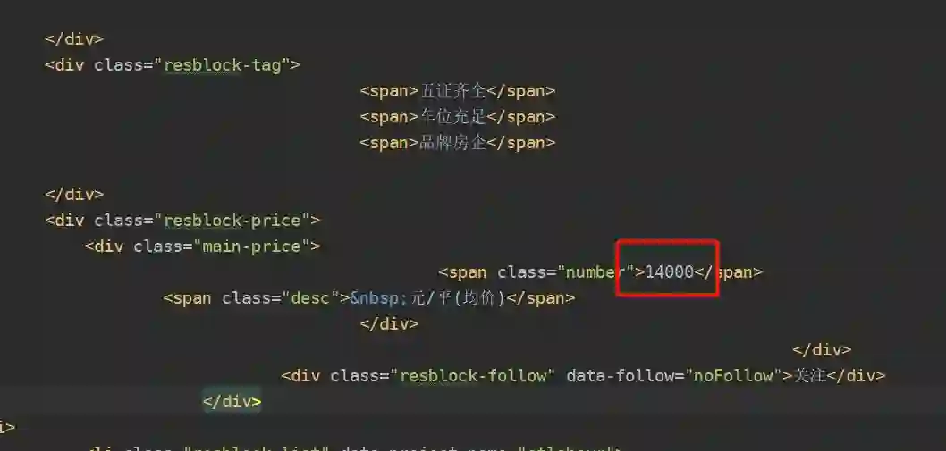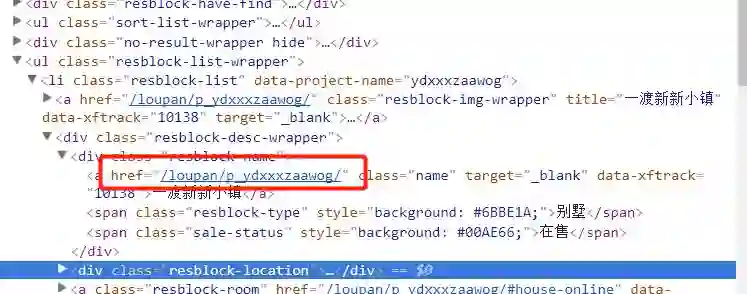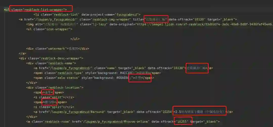然后我们主要关心的数据有楼盘的名字,售卖状态,地点以及价格等。然后查看网页源码之后发现,我们想要的数据在resblock-list-wrapper这个class里面。所以首先取到这个class下面的全部内容,然后再挨个提取我们想要的数据。