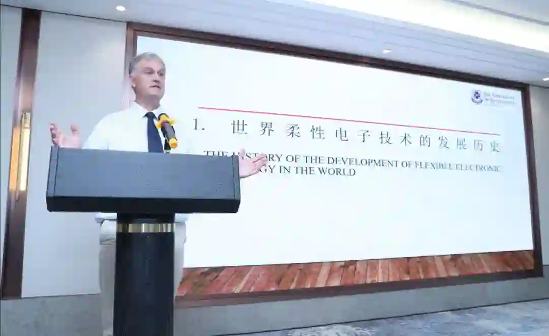 保罗·伯恩作题为《柔性电子技术全球发展现状和趋势》的主旨演讲 周烨/摄