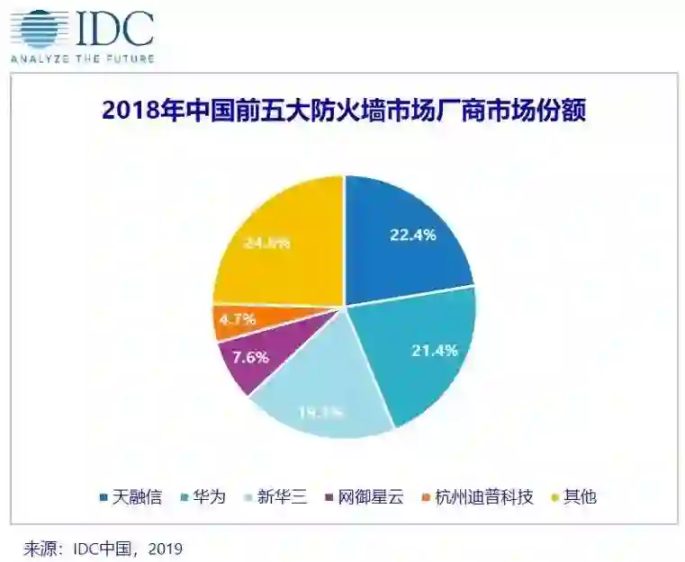 天融信(TopSec)不断加大其防火墙产品的研发投入力度,探寻不同行业业务场景下的基础安全防护需求,提出了一系列与业务场景相结合的产品,最终以22.4%的市场占比排在第一位;