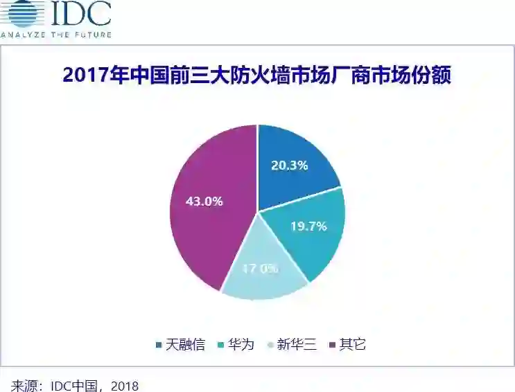 2018年防火墙市场厂商市场份额排名前三的厂商分别为天融信、华为和新华三。