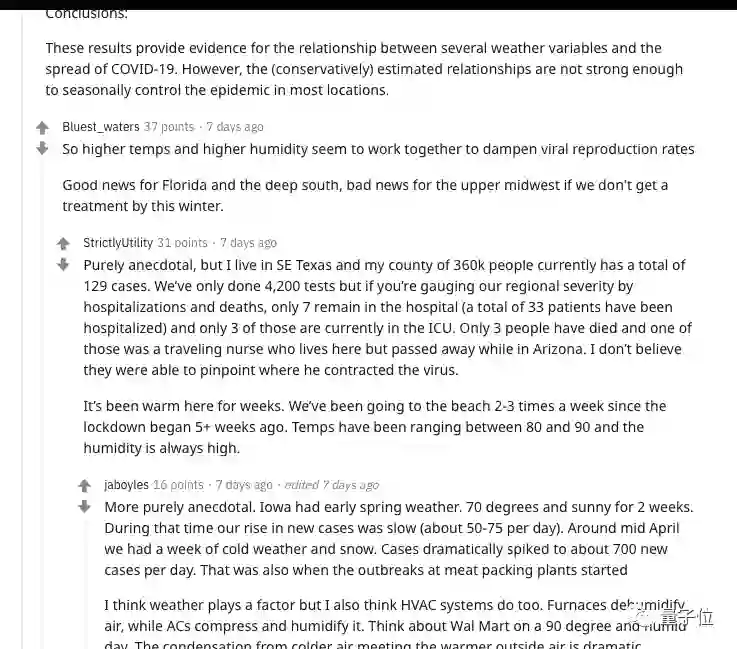 对此,公众焦点是温度升高对自身地区的影响,Reddit讨论集中在温度升高对疫情的控制,而研究者警告,完全依赖温度升高不足以控制住疫情,控制疫情还和管理水平、风俗习惯以及人口密度等因素密切相关。