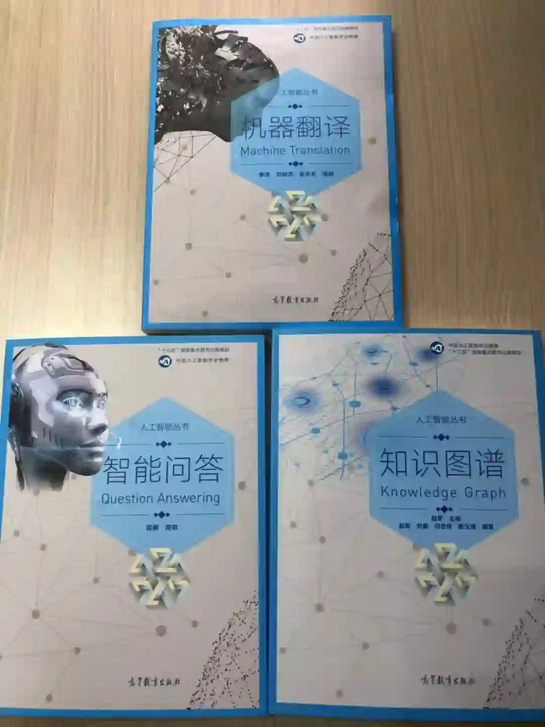 不过趁着春节,看到大家调戏对联机器人的热情高涨,所以想结合这个活动做一期赠书活动,书籍是近期高等教育出版社联合国内人工智能研究机构出版的《机器翻译》、《智能问答》和《知识图谱》三本书籍,前两本来自微软亚洲研究院周明老师研究组、后一本来自自动化所赵军老师研究组,都是NLP研究的热点和难点,也是国内难得的专业书籍,我已购入这三本图书,准备作为假期读物: