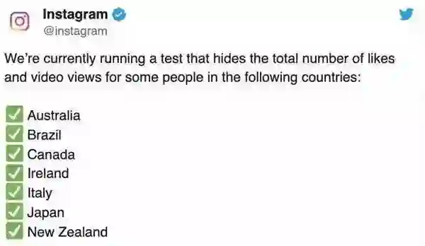 为了摘除用户自我表达的枷锁,Instagram于2019年下半年开始在加拿大、日本等八个国家实行隐藏点赞数的措施。隐藏后用户自己还是可以看到自己的动态收到了赞的数量,其他人只能看到点赞人的列表。