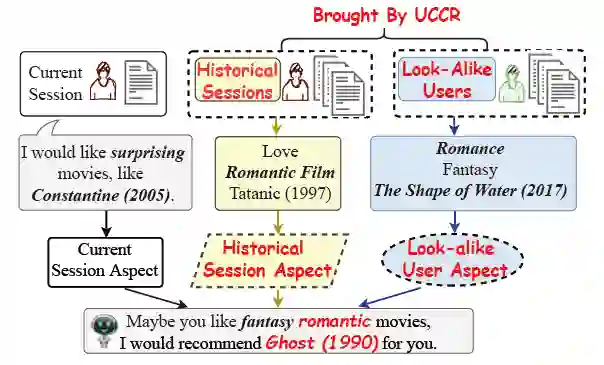 不难看出,以上方法均是利用自然语言理解技术,更好地建模当前对话信息。而作为推荐系统的一种,对话推荐的核心问题也应当是理解用户,建模用户行为。尽管当前对话信息在CRS中至关重要,我们发现用户的多方面(multi-aspect)信息,如用户历史对话、相似用户信息等,可以很好地辅助用户兴趣建模,更全面地理解用户。如下图所示,之前的CRS方法仅基于当前对话捕捉用户兴趣,只能捕捉到用户的基础兴趣偏好:奇幻电影,而无法建模用户隐式兴趣偏好:爱情电影。而这时历史对话信息、相似用户信息则提供了很好地补充。