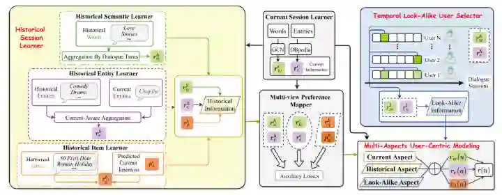可以看出,不同于前人的CRS方法,我们考虑历史会话信息和相似用户信息,更系统、全面地理解CRS中的用户。