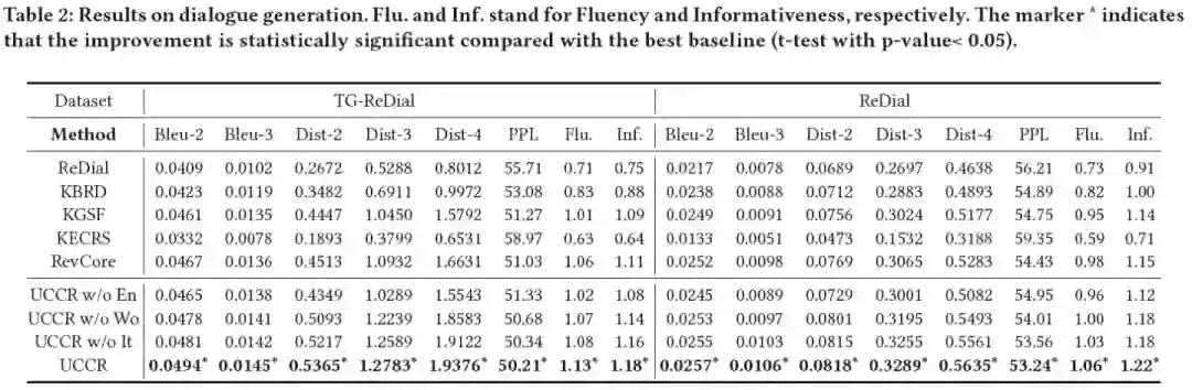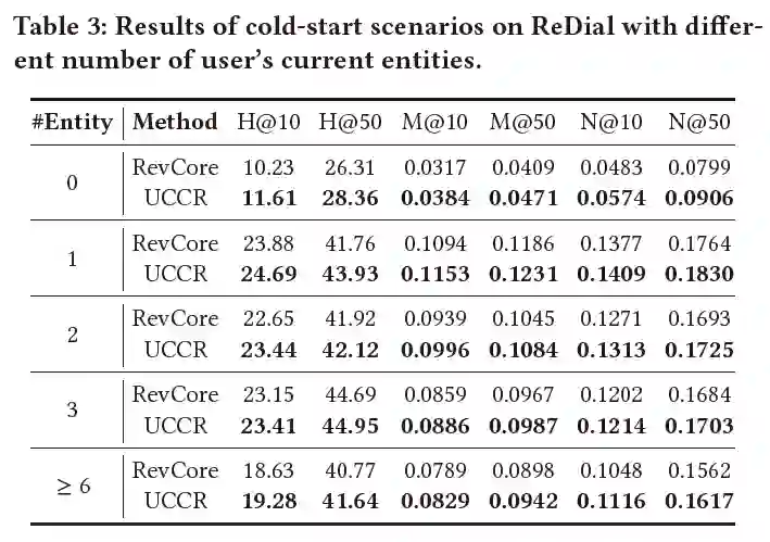 本文在中文、英文公开的对话推荐数据集上进行实验验证UCCR的有效性,实验表明UCCR在推荐和对话任务上相较于SOTA方法均有所提升。同时,UCCR可以很好地应对冷启动场景(即用户当前会话信息缺失时),历史会话和相似用户信息成为了很好地补充。