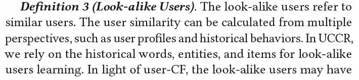 Temporal Look-Alike User Selector:这部分的核心思想是:历史行为(即提到的单词、实体)相似的用户,其当前兴趣偏好有更大概率相似。因此我们可以用相似用户信息辅助target用户的兴趣建模。由于CRS中用户兴趣随着对话推进不断变化,我们将用户每一次交互历史都和target用户历史进行比较,学习其中最有用的信息。具体地,以用户历史单词为例,其相似用户信息表示为: