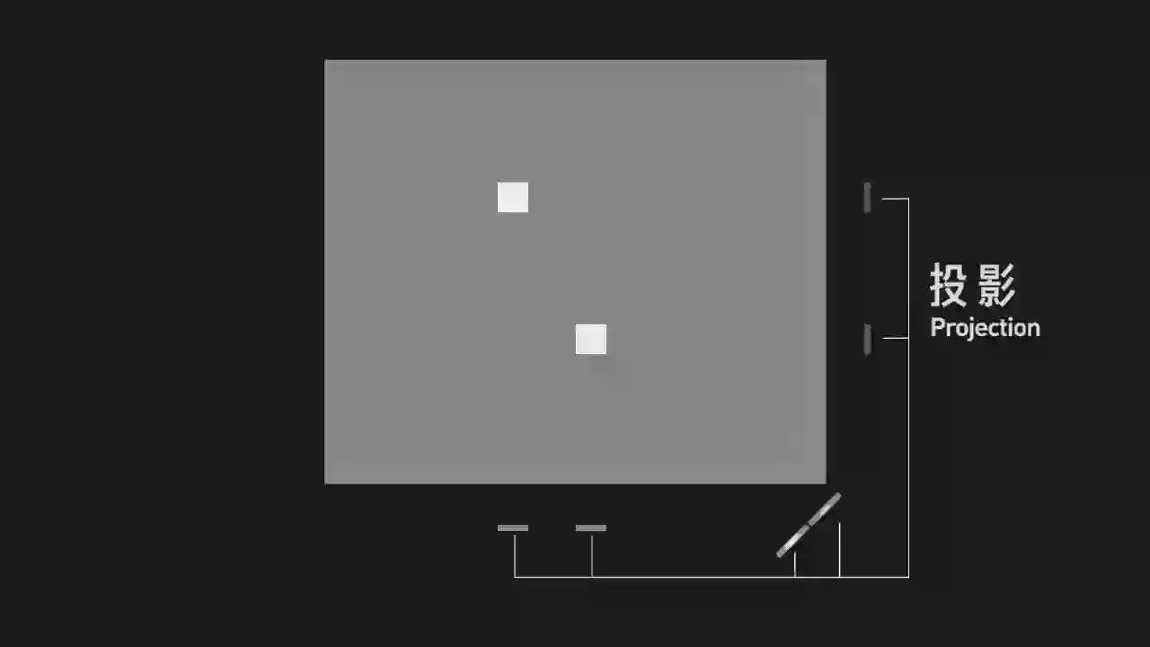 我们看一个简单的例子。画面上有两个方块,用 X 光从横、竖、斜向照射后会得到三个投影。