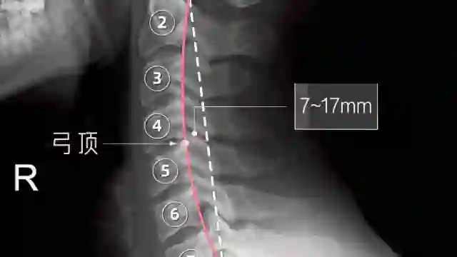 我们先看颈椎,从第二椎体的齿状突上缘至第七椎体下缘连线,画出一个弓形。正常情况下,弓顶在第五椎体上缘,且到连线的距离约 7~17mm 。