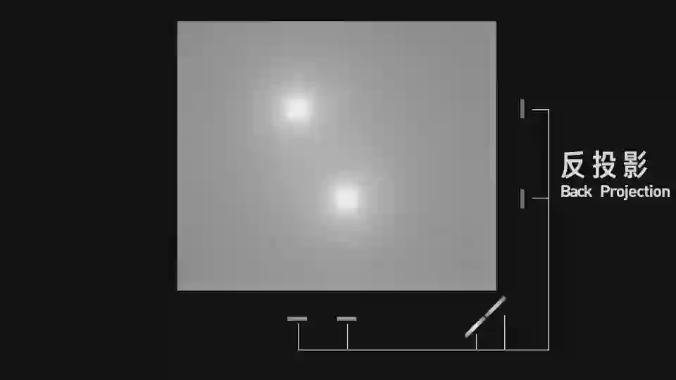 我们先把横向的投影延伸到整个画面,再叠加上竖向、斜向的反投影,不断叠加其他角度的反投影,就可以大致看到原始的两个方块。