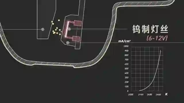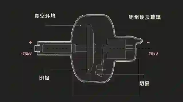 在阴极的这个位置,装有钨制灯丝,单独接入 6~12V 的低压电,像灯泡一样发光发热并放出高能电子,温度越高,电子越多。