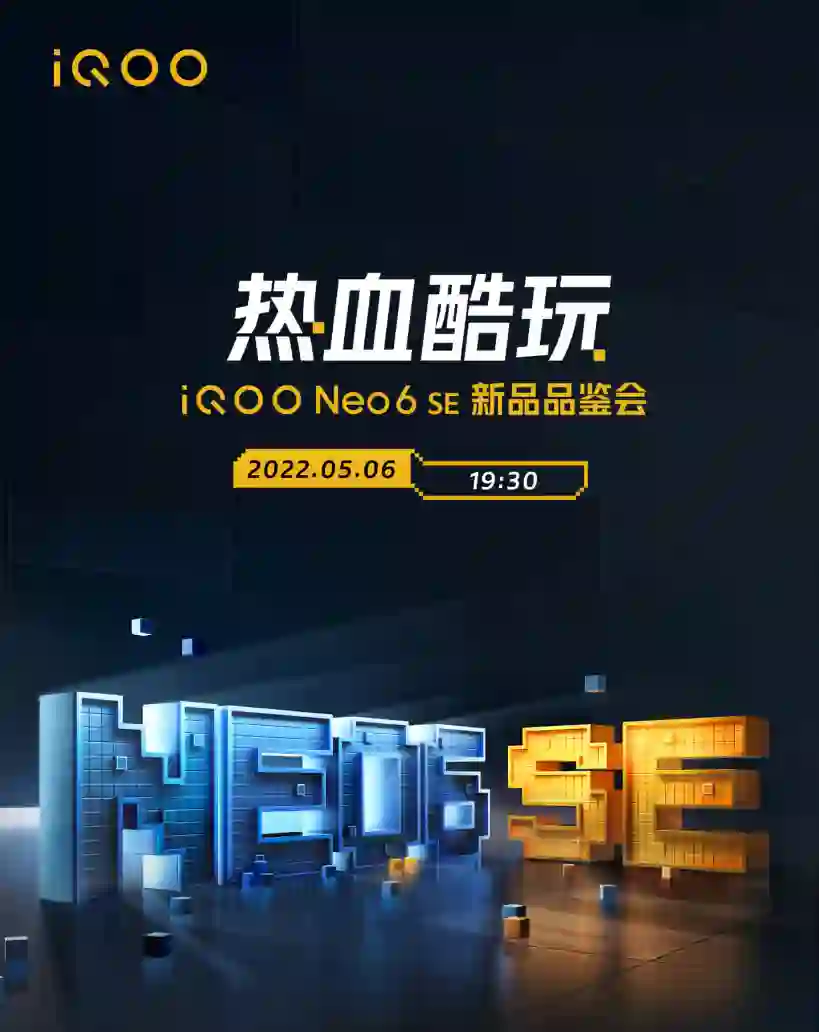 iQOO 官方今日发文宣布,将于 5 月 6 日 19:30 召开品鉴会,正式发布 iQOO Neo6 SE 机型。iQOO 官方公布的宣传图显示,iQOO Neo6 SE 将搭载骁龙 870 处理器,性能调校达 11 轮,调校次数达到常规机型 4 倍,玩《王者荣耀》1 小时高清画质平均帧率 118.6FPS。数码博主@数码闲聊站还曝光成分,iQOO Neo6 SE 将会采用 6.62 英寸居中打孔 OLED 屏幕,分辨率 FHD+,支持 120Hz 高刷,内置电池容量 4700mAh,支持 80W 有线快充。