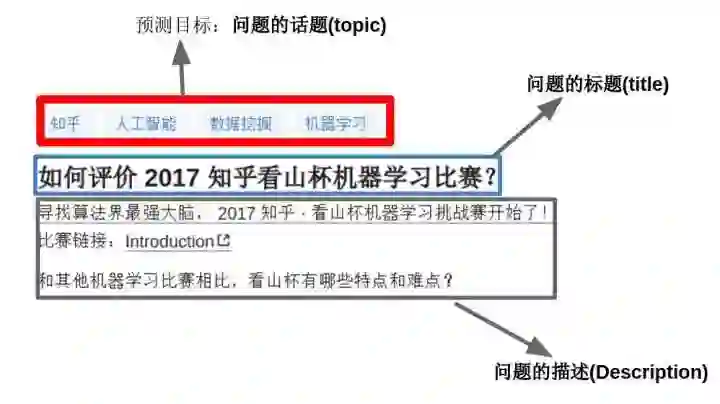 这是一个文本多分类的问题:目标是“参赛者根据知乎给出的问题及话题标签的绑定关系的训练数据,训练出对未标注数据自动标注的模型”。通俗点讲就是:当用户在知乎上提问题时,程序要能够根据问题的内容自动为其添加话题标签。一个问题可能对应着多个话题标签,如下图所示。