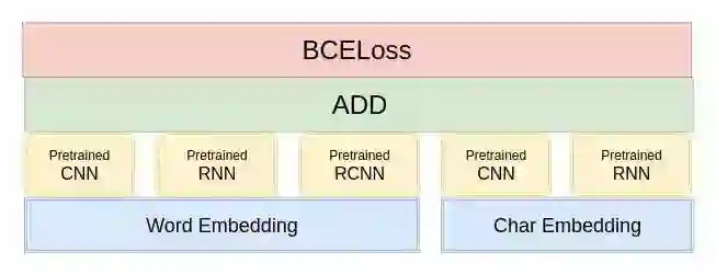 其实模型融合的方式,我们换一种角度考虑,其实就是一个很大的模型,每一个分支就像多通道的TextCNN一样。那么我们能不能训练一个超级大的模型?答案是可以的,但是效果往往很差。因为模型过于复杂,太难以训练。这里我尝试了两种改进的方法。