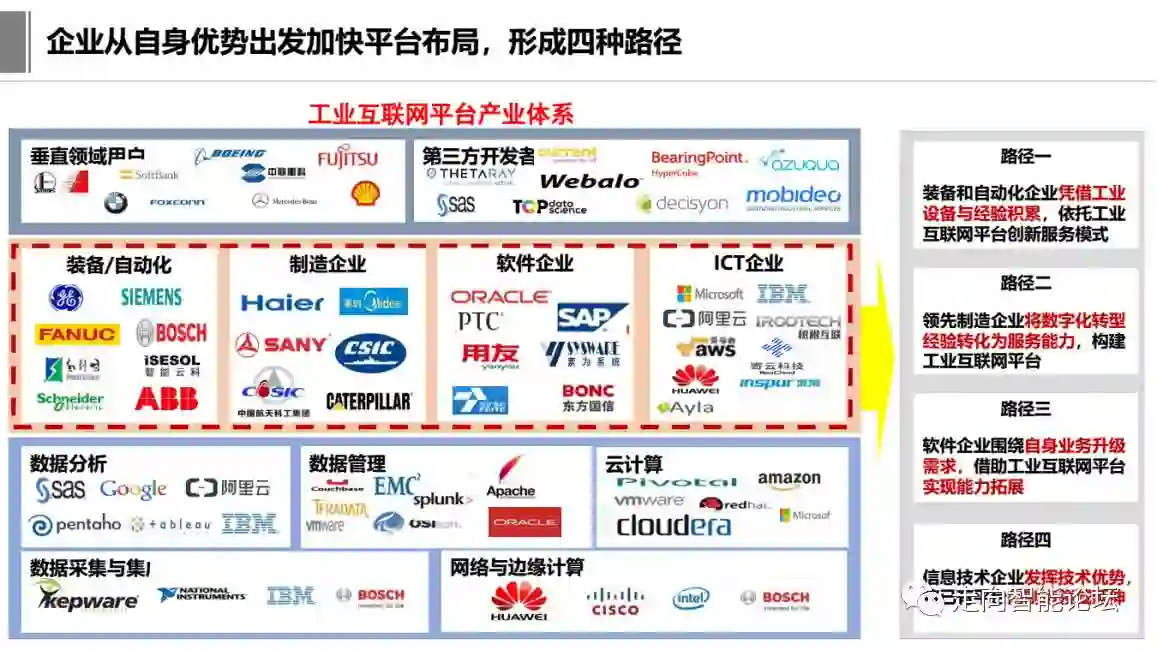 刘默指出,目前不同类型企业均在积极布局工业互联网平台,装备和自动化企业、领先制造企业、工业软件企业、信息技术企业等,分别从自身优势出发加快平台建设,形成四种发展路径。