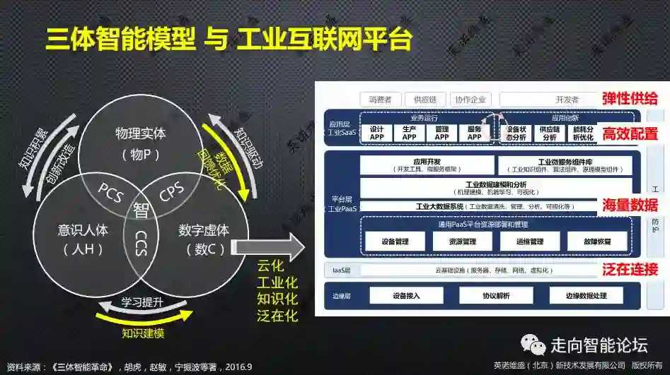 赵敏从讲解三体智能模型入手,指出智能制造第一步是通过CPS实现联接,提出走向智能制造的三部曲:数字化一切可以数字化的事物、网联一切可以联接的事物、由数据的自由流动而实现知识泛在。工业互联网平台作为新一代信息通信技术与现代工业技术深度融合的产物,是三体智能模型中数字虚体的转型升级,是数字虚体CYBER的云化、工业化、知识化和泛在化。