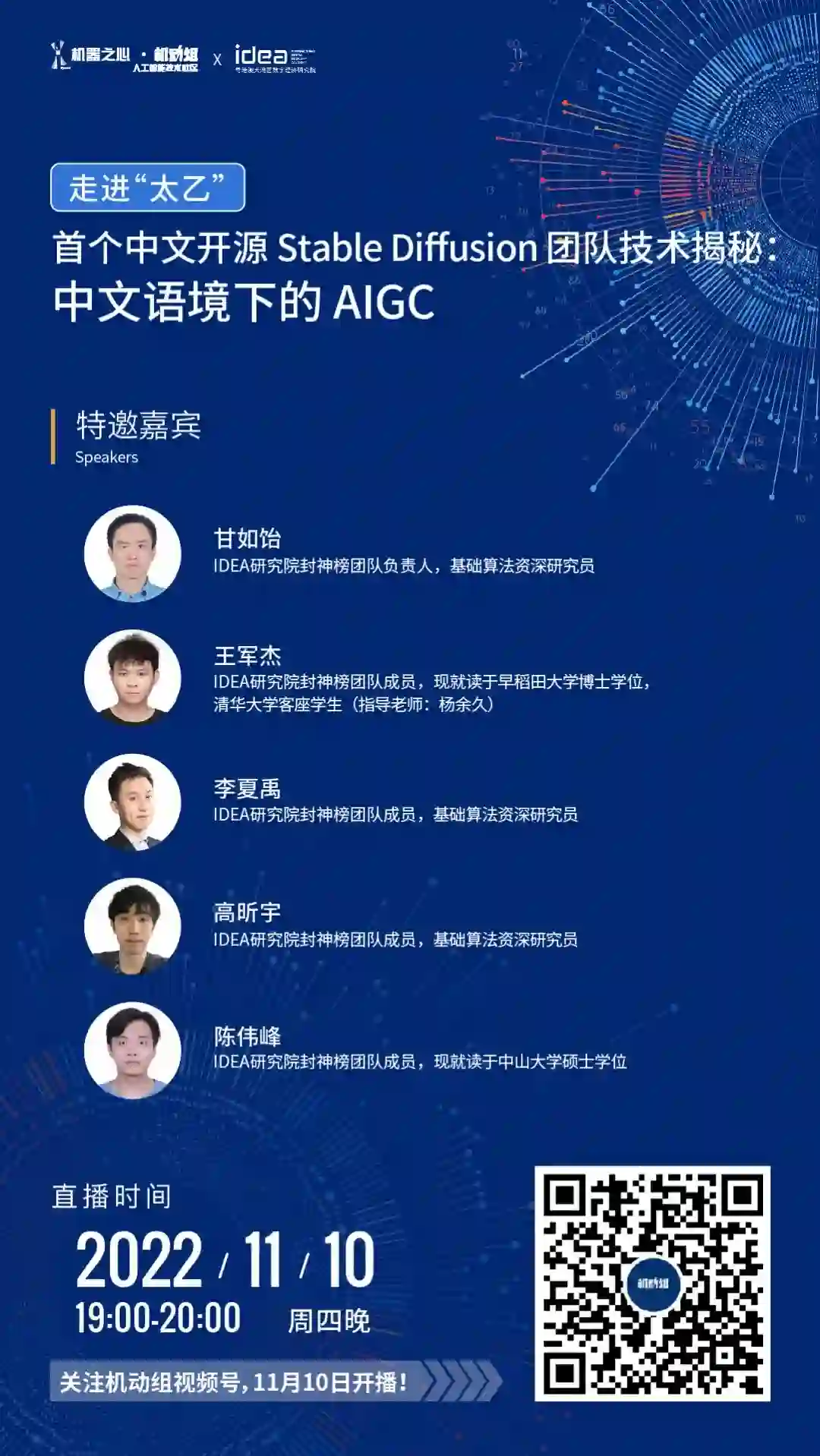 机器之心上周发布的相关文章引起了国内 AI 社区的极大关注(参考:首个中文Stable Diffusion模型开源,IDEA研究院封神榜团队开启中文AI艺术时代)。为了方便读者了解此项目,机器之心最新一期机动组直播邀请到了封神榜团队在周四线上分享揭秘首个中文 Stable Diffusion 模型背后的关键技术。欢迎对 AIGC 感兴趣的小伙伴前来交流。