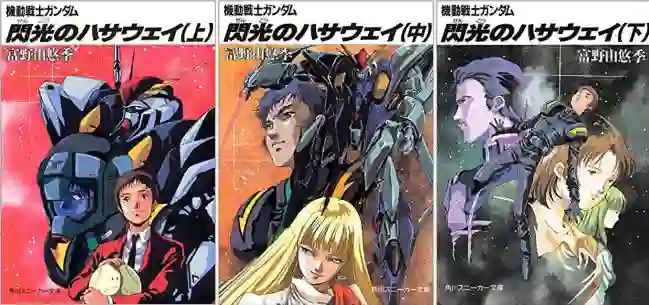 《闪光的哈撒维》就是从这种挫折感中升华而成的作品:想要成为大人的青涩主人公,加入了反政府的恐怖组织,然后被逮捕遭处决。富野由悠季在这部小说中描写了在成为大人之前就死去了的Newtype,以及他身上的“不可能性”。