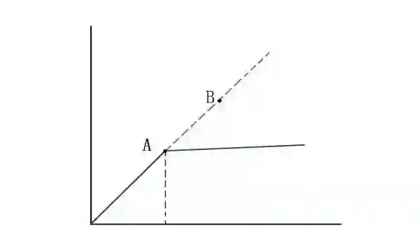 这里以上图为例进行说明。上图中蓝线为科技发展速度,原点到A点为战后的科技爆发时期,A点是科技发展开始出现副作用的时点,B点为御宅族的理想。从A点开始,科技发展放缓,但是御宅族的理想却一直延伸,停留在了高速发展时期的延长线上。