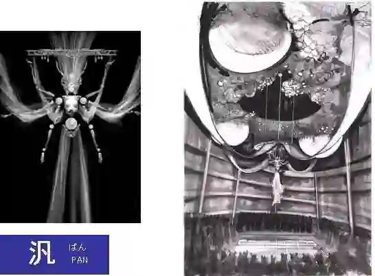我感觉这部作品可以称得上是押井守版的《百亿之昼千亿之夜》了。主角的虽然有着的人脸,但是明显不是人类。旁边还有竹谷隆之制作的长着人脸的鸟兽。押井守在展览会场中表现出了自然的装置艺术(在现代艺术上指无法用雕刻、绘画等原有的艺术形式表达的作品连同其本来的环境,将其整体呈现给观众的艺术空间)。