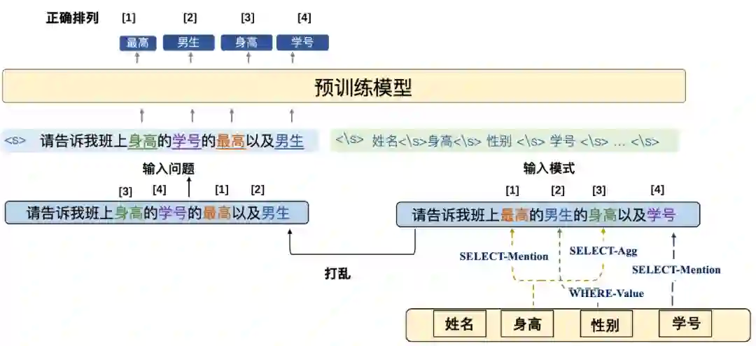 与预训练语言模型相比,表格预训练模型在模式存在的环境下找到合适的模式表征也至关重要,如下图所示,通过扰动问题中涉及到模式链接的词汇,然后通过预训练模型来恢复。