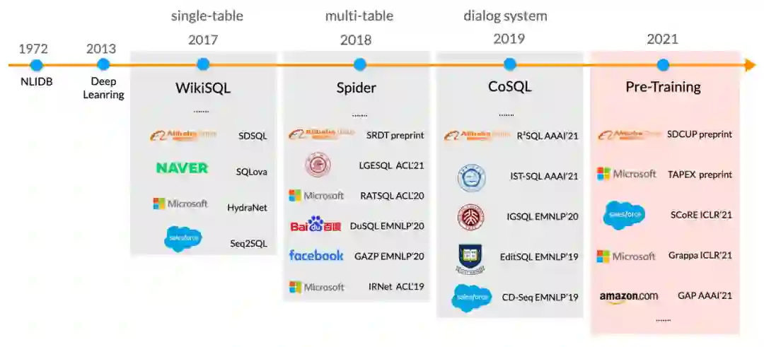 表格问答技术在金融、政务、教育、医疗等场景均有广泛应用前景,因此受到了学术界和工业界的高度关注。以 Text-to-SQL 解析任务为例,自从 2017 年 Salesforce 发布 WikiSQL 数据集以来,就一直受到业界的持续关注和投入,SQL 解析的准确率已经从 2017 年的 35% 提升到 2021 年的 91%。另外,业界也在持续构建更加复杂、更加符合真实场景的数据集,从单表到多表、从单轮到多轮,为该方向的发展不断注入活力。