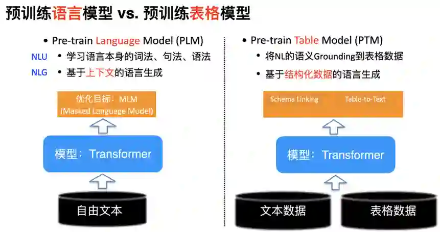 和 BERT、GPT 等预训练语言模型不同,预训练表格模型旨在同时建模自然语言和结构化表格数据,在语言理解的维度希望能够将自然语言的语义 Grounding 至表格的结构内容当中,在语言生成的维度希望能够基于结构化数据生成流畅的文本。