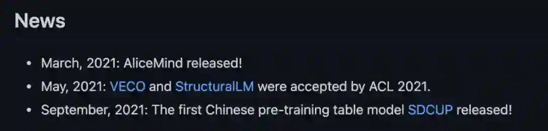 12 月 2 日,达摩院深度语言模型体系 AliceMind 发布中文社区首个表格预训练模型 SDCUP,该模型在全球权威表格数据集 WikiSQL 和 SQuALL 上取得了业界最优效果,相关模型和训练代码已经开源于阿里巴巴深度语言模型体系 AliceMind 中。