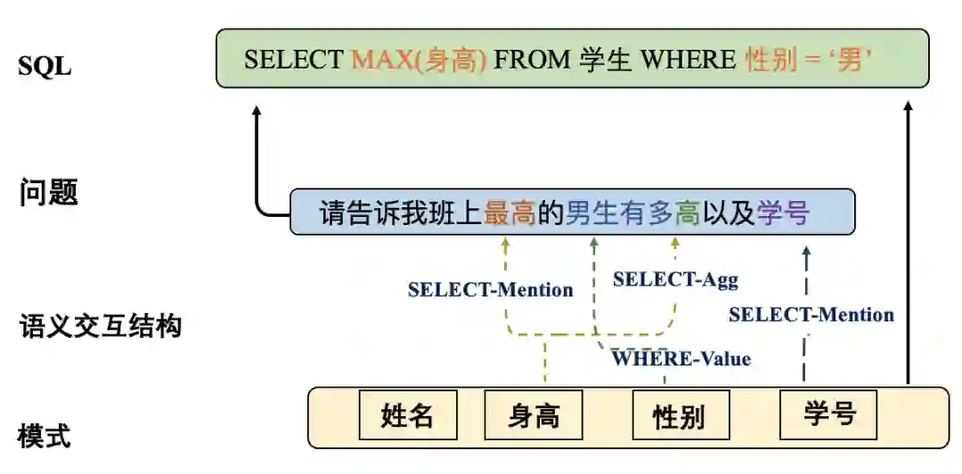预训练表格模型最终的目标是为了提升下游 Text-to-SQL 任务的效果,如下图所示,在自然语言和表格的 schema 之间,存在这一个复杂的语义交互结构(Schema Linking),对于该结构的识别和建模已经成为 Semantic Parsing 任务中的重要瓶颈。然而,业界已有的表格预训练模型没有显式建模自然语言问题和表格数据之间的语义交互结构。