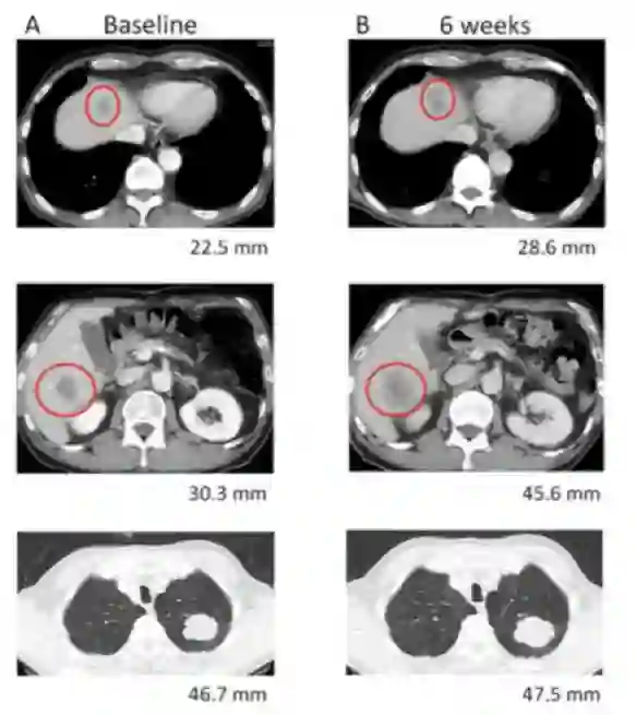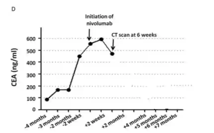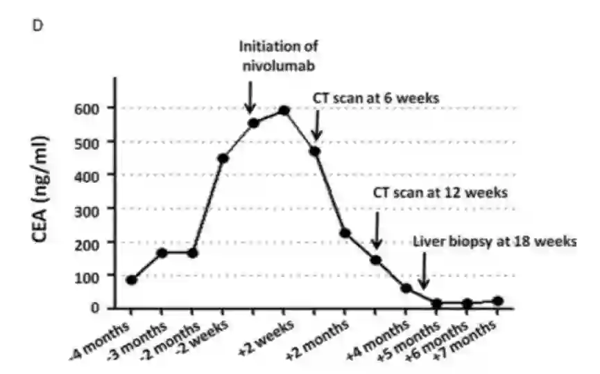 *纳武利尤单抗治疗6周后评价:肝脏病灶增大,血清CEA降低。