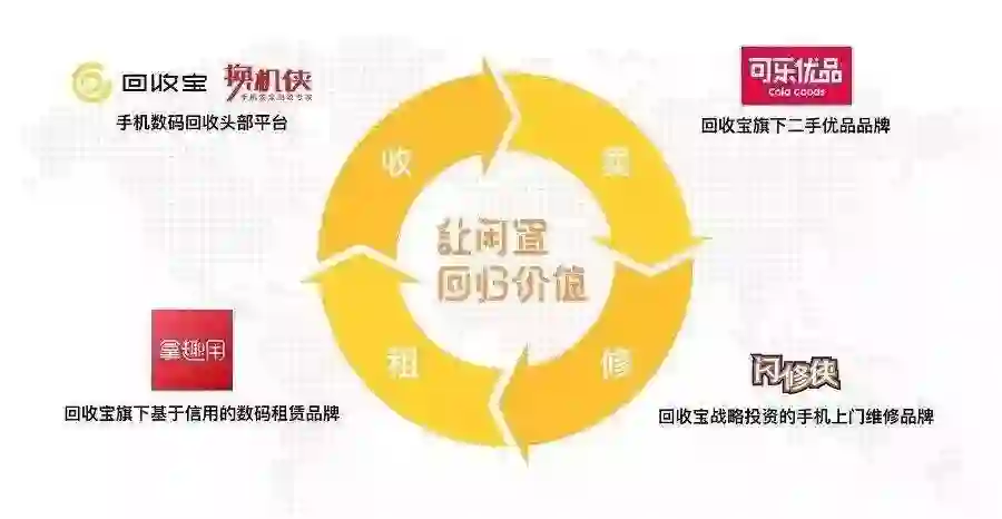 据公开信息显示,回收宝从二手手机回收起家,最开始给华为、vivo、苹果等手机巨头提供以旧换新服务,接着推出手机回收ATM机开展C2B回收业务,如今已构建覆盖收、租、买、卖的循环经济生态,除了回收还拥有二手优品商城“可乐优品”、3C产品租赁平台“拿趣用”,以及投资了手机维修品牌“闪修侠”。